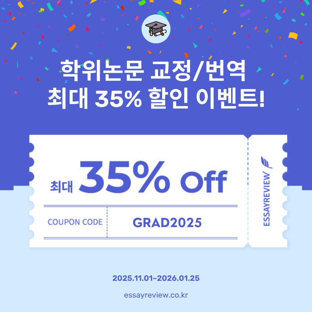 ํ•™์œ„๋…ผ๋ฌธ ์‹œ์ฆŒ์„ ๋งž์•„ ์—์„ธ์ด๋ฆฌ๋ทฐ๊ฐ€ 2025 ํ•˜๋ฐ˜๊ธฐ ํ•™์œ„๋…ผ๋ฌธ ๊ต์ •/๋ฒˆ์—ญ ํŠน๋ณ„ ํ• ์ธ ์ด๋ฒคํŠธ๋ฅผ ์ค€๋น„ํ•˜์˜€์Šต๋‹ˆ๋‹ค.