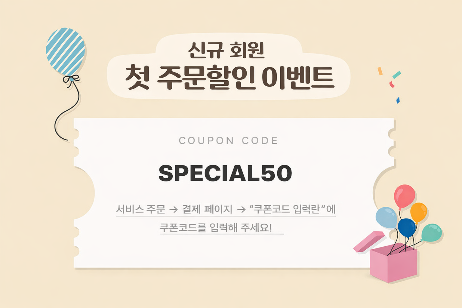 4. 사용 방법 : 서비스 주문 > 결제 페이지 > “쿠폰 코드 입력란”에 쿠폰 코드(SPECIAL50)를 입력해 주세요!
